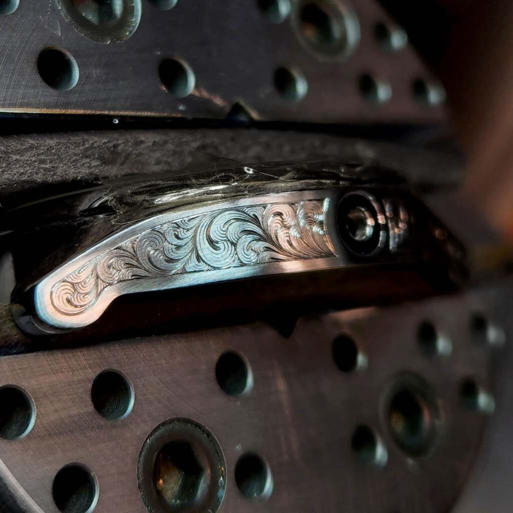 The case of this timepiece is adorned with our most advanced hand engraving, the American Gun Scroll. Inspired by the artistry of fine American shotguns from the early 1900s, the scrollwork transforms the case into a canvas of intricate, interwoven patterns. Each line is cut with extraordinary care, creating a surface that catches and reflects light with dynamic brilliance. Elegant yet powerful, this engraving elevates the watch case into a statement of heritage and craftsmanship — a true tribute to one of America’s most historic engraving traditions.