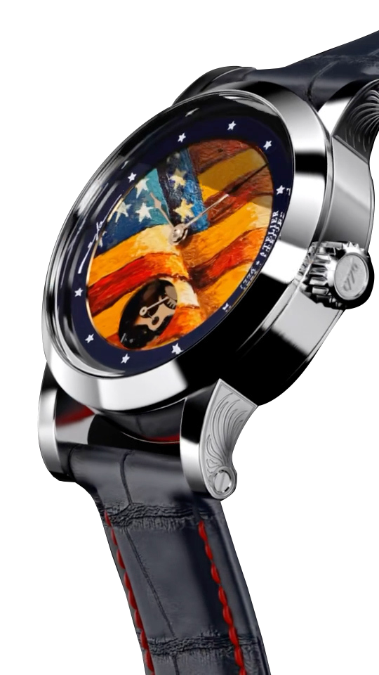 The dial of New Glory is a true masterpiece, hand-painted by the renowned Scott LoBaido. Inspired by the American flag, it captures the enduring symbolism of Old Glory while embracing the optimism of a new era. Encircled by a chapter ring adorned with stars marking the hours, the design balances patriotic pride with timeless elegance.
