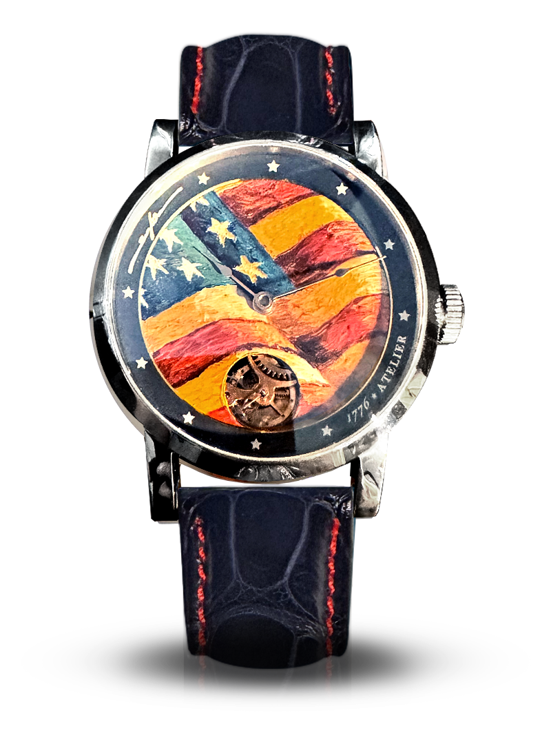 New Glory is an exceptionally rare creation, limited to just 13 pieces—a deliberate nod to the 13 original colonies where this great nation began. This limited edition is not only a tribute to America’s founding but also marks the very first collaboration between 1776 Atelier and Scott LoBaido, merging fine watchmaking with bold artistic expression. Each piece represents a unique work of art and a celebration of American ingenuity and heritage.