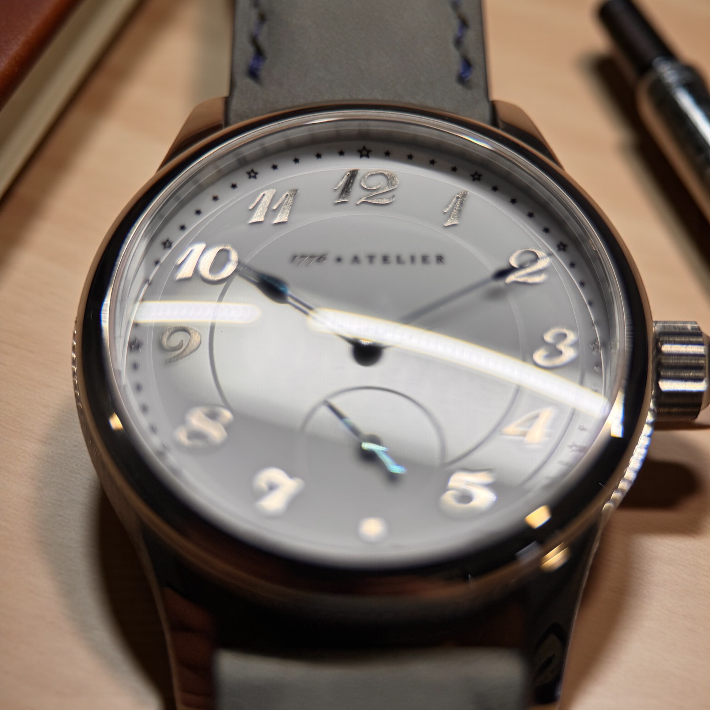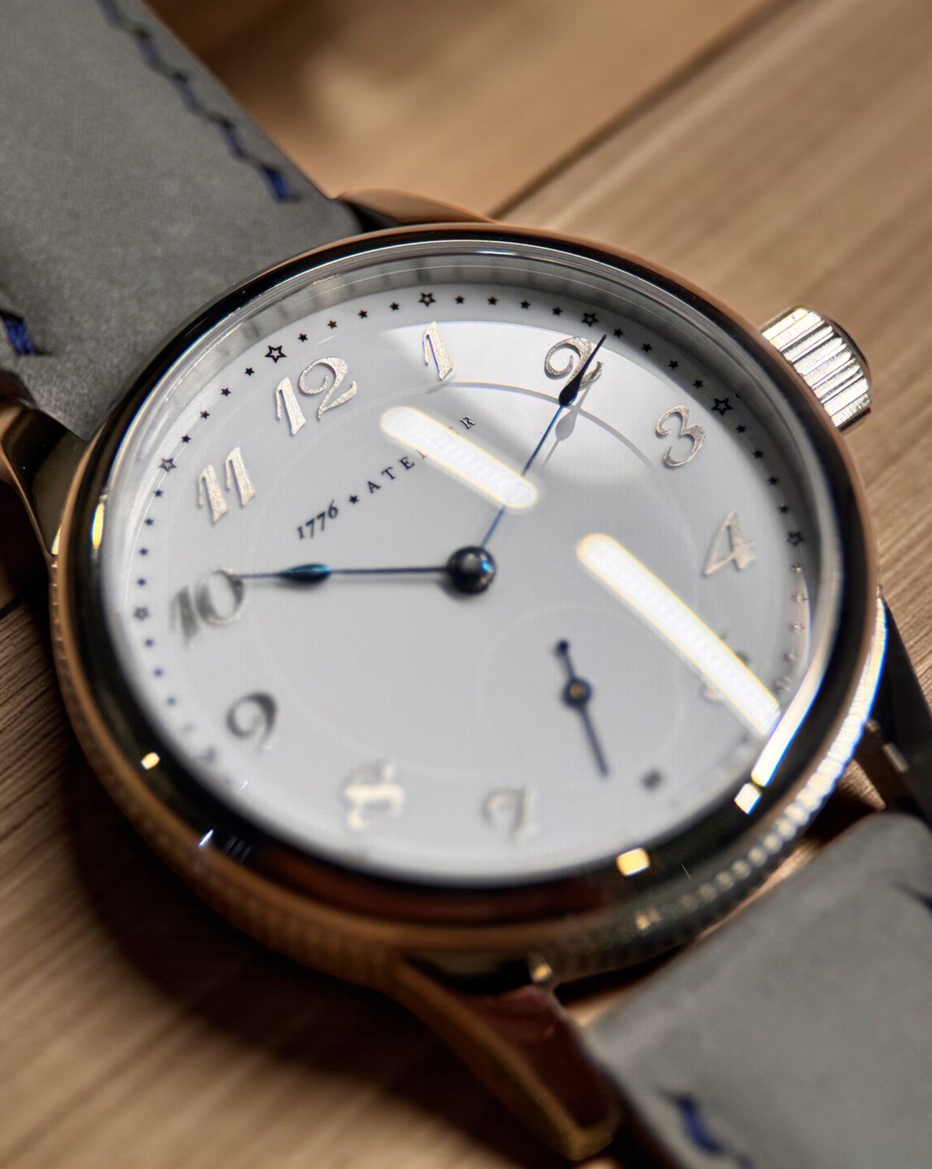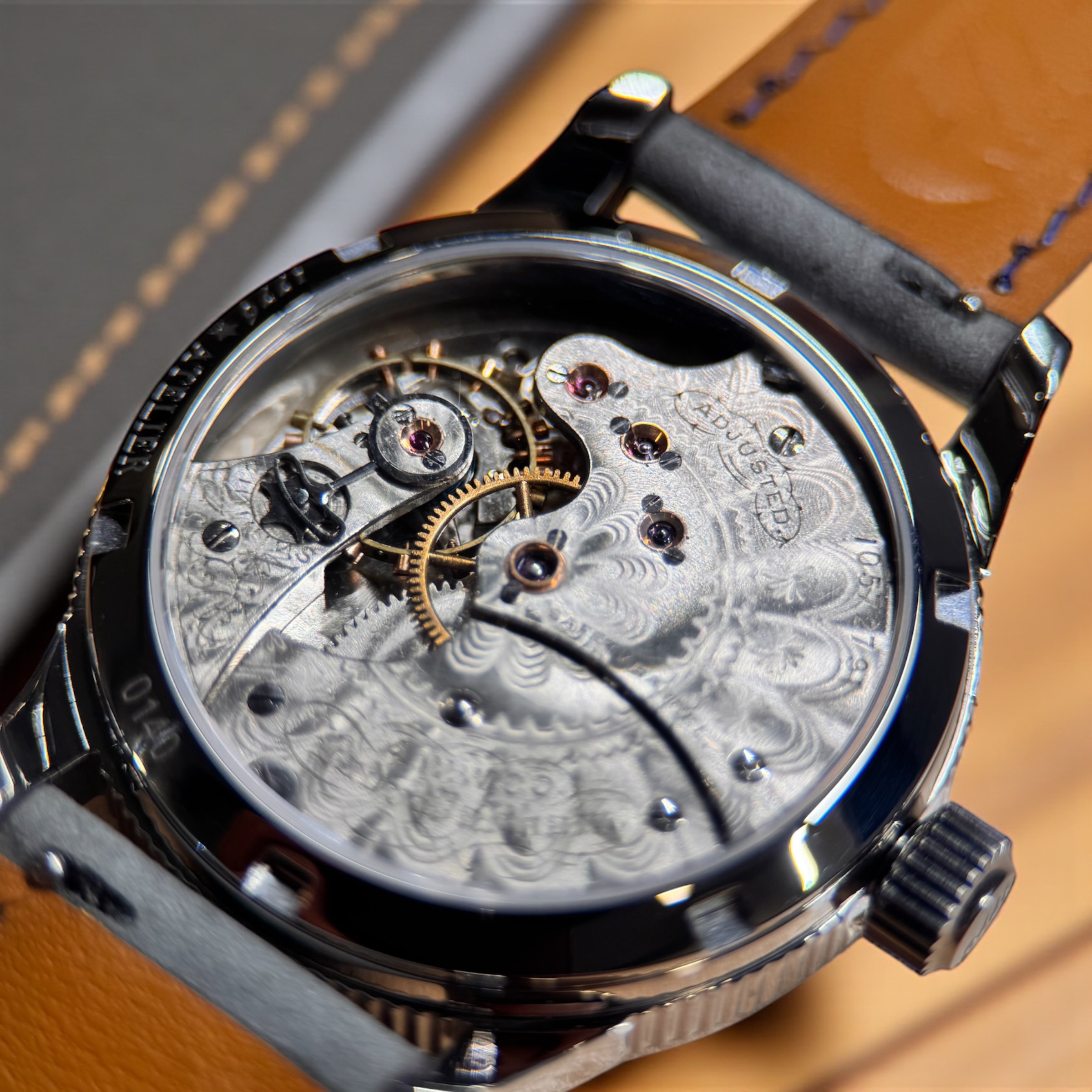 This historic Waltham timepiece was originally completed in 1906 in Waltham, Massachusetts, and features one of the company’s proprietary 15-jewel movements, beautifully finished with intricate damaskeening beneath a traditional three-quarter plate. The original hands have been carefully preserved and restored using thermal bluing—a precise, hand-applied technique that enhances both their deep hue and corrosion resistance. The original dial has been replaced with our own proprietary enamel dial—one of the defining trademarks of our conversion work and a key detail that sets our pieces apart from other offerings in the marketplace. Raised Breguet numerals, finished in a brushed metallic tone, provide contrast and dimension, echoing the sheen and texture of the stainless steel case while introducing subtle modernity. Twelve stars mark the hours around the numerals, while a thirteenth, embedded within our signature, serves as a quiet tribute to the original thirteen colonies and the founding ideals of 1776. To enrich the enamel’s surface, we have introduced delicate etching around the subdial and central area—an understated texture that gently disrupts the luster, adding depth and visual interest without overwhelming the design. Housed in a 40 mm surgical-grade 316L stainless steel conversion case, the watch offers an ideal fit for nearly any wrist. With both crown and caseback gaskets, it is water-resistant to 50 meters, though we recommend avoiding prolonged water exposure. Fully serviced and thoughtfully restored, this timepiece bridges over a century of American craftsmanship and is ready to accompany you on your next chapter.