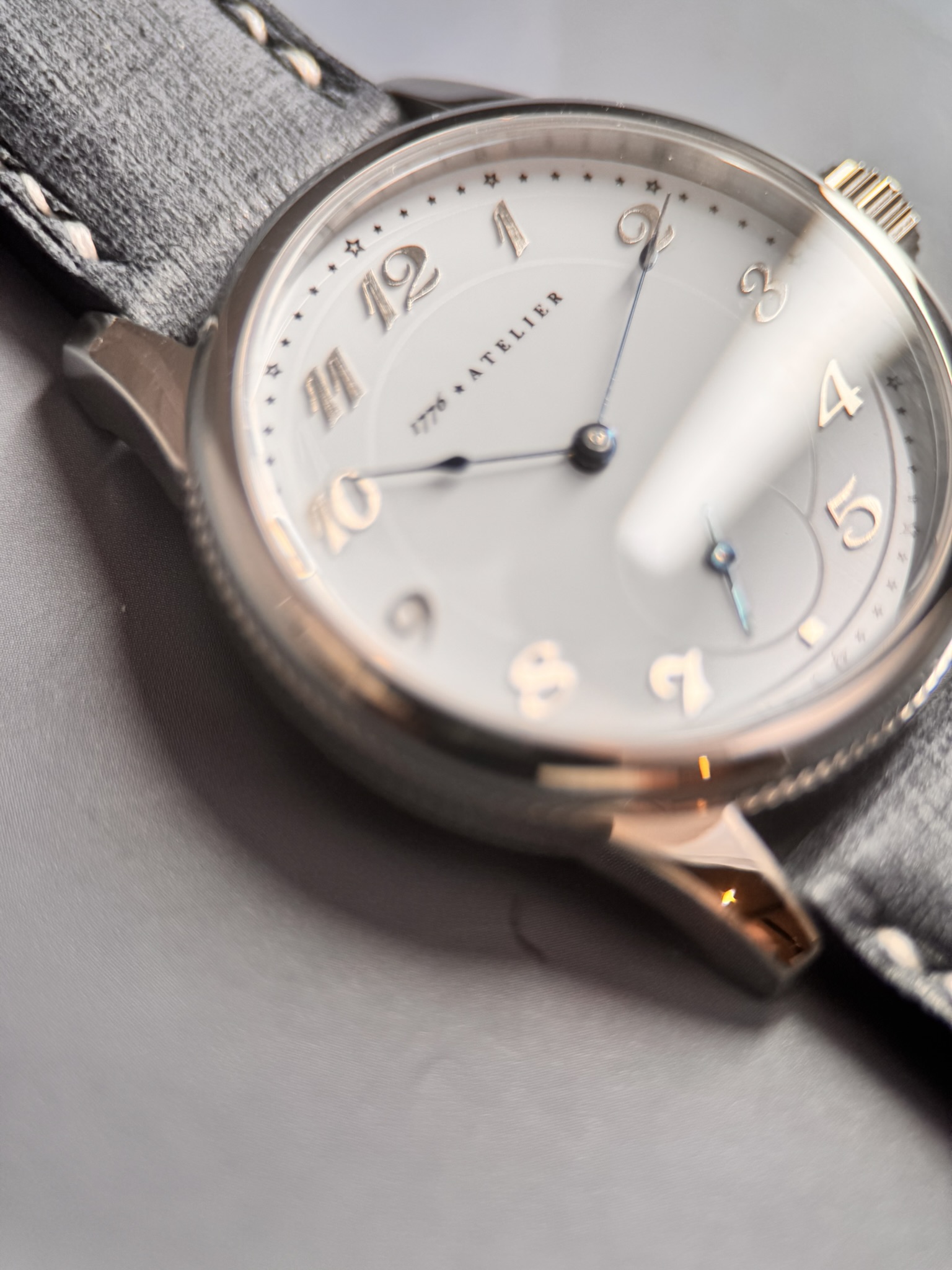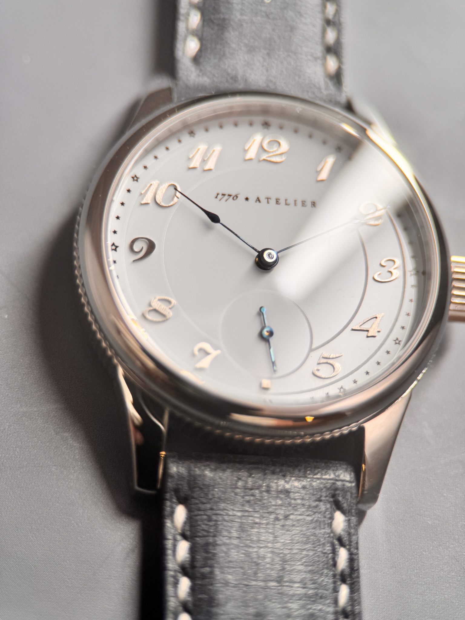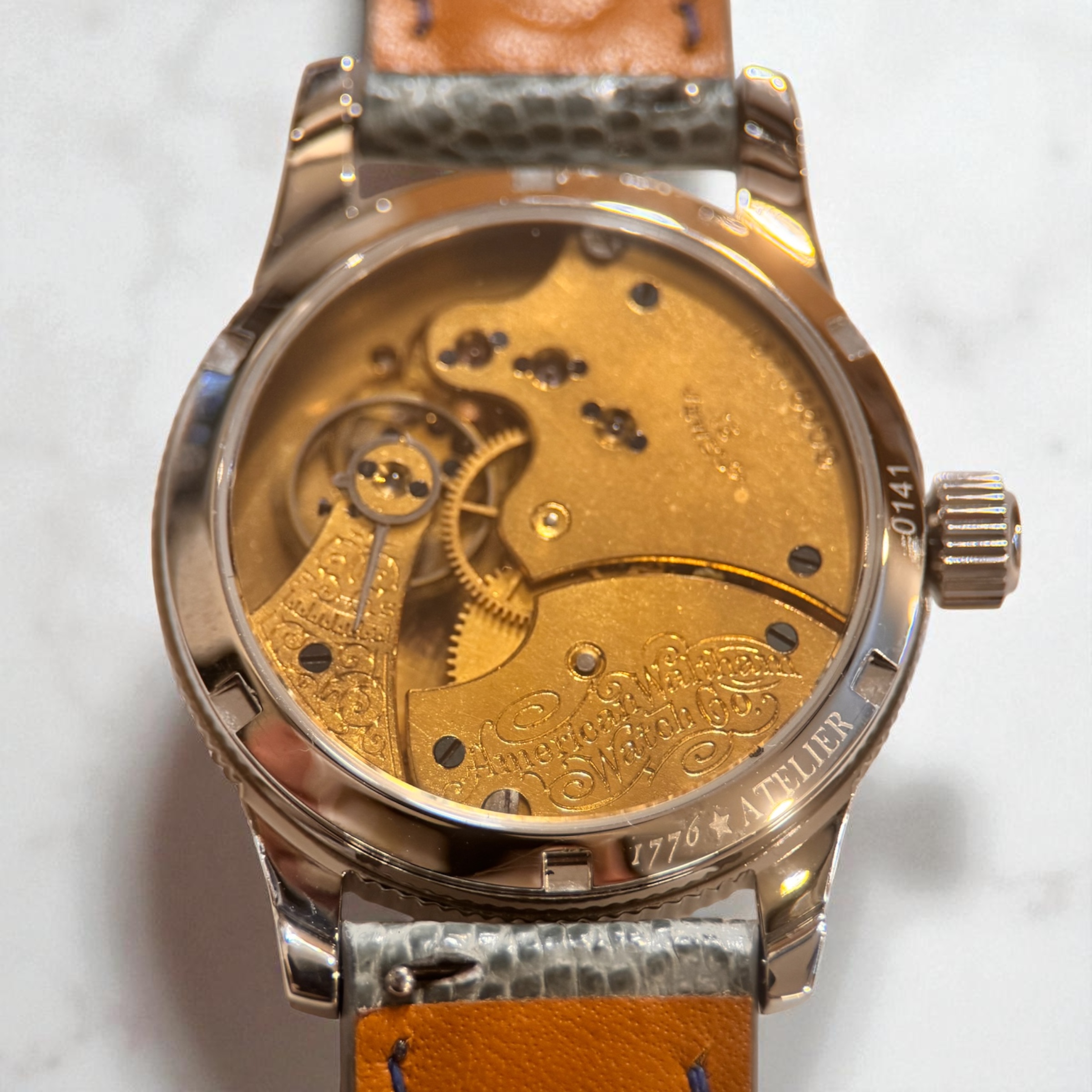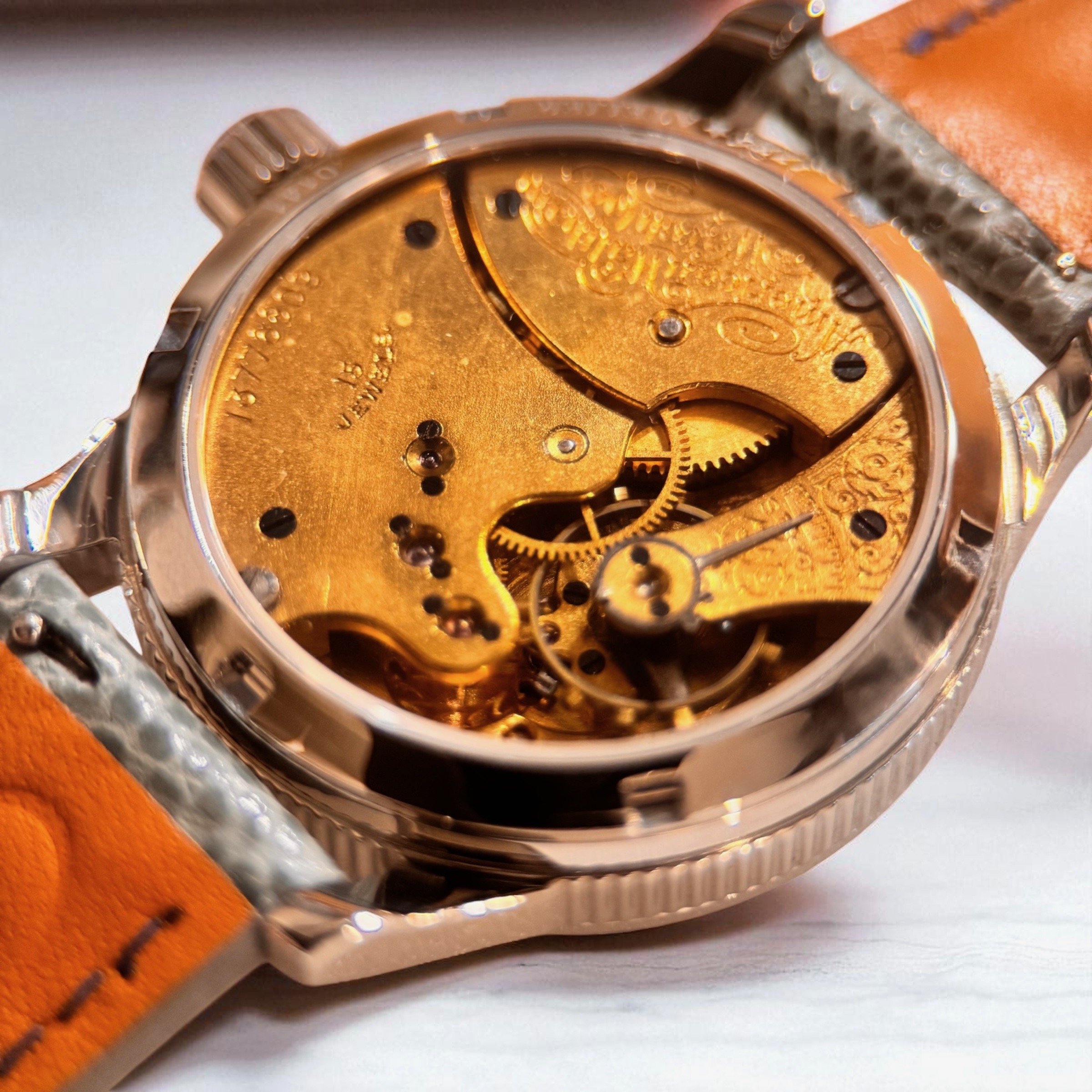 This historic Waltham timepiece was originally completed in 1906 in Waltham, Massachusetts, and features one of the company’s proprietary 15-jewel movements, beautifully finished with intricate damaskeening beneath a traditional three-quarter plate. The original hands have been carefully preserved and restored using thermal bluing—a precise, hand-applied technique that enhances both their deep hue and corrosion resistance. The original dial has been replaced with our own proprietary enamel dial—one of the defining trademarks of our conversion work and a key detail that sets our pieces apart from other offerings in the marketplace. Raised Breguet numerals, finished in a brushed metallic tone, provide contrast and dimension, echoing the sheen and texture of the stainless steel case while introducing subtle modernity. Twelve stars mark the hours around the numerals, while a thirteenth, embedded within our signature, serves as a quiet tribute to the original thirteen colonies and the founding ideals of 1776. To enrich the enamel’s surface, we have introduced delicate etching around the subdial and central area—an understated texture that gently disrupts the luster, adding depth and visual interest without overwhelming the design. Housed in a 40 mm surgical-grade 316L stainless steel conversion case, the watch offers an ideal fit for nearly any wrist. With both crown and caseback gaskets, it is water-resistant to 50 meters, though we recommend avoiding prolonged water exposure. Fully serviced and thoughtfully restored, this timepiece bridges over a century of American craftsmanship and is ready to accompany you on your next chapter.