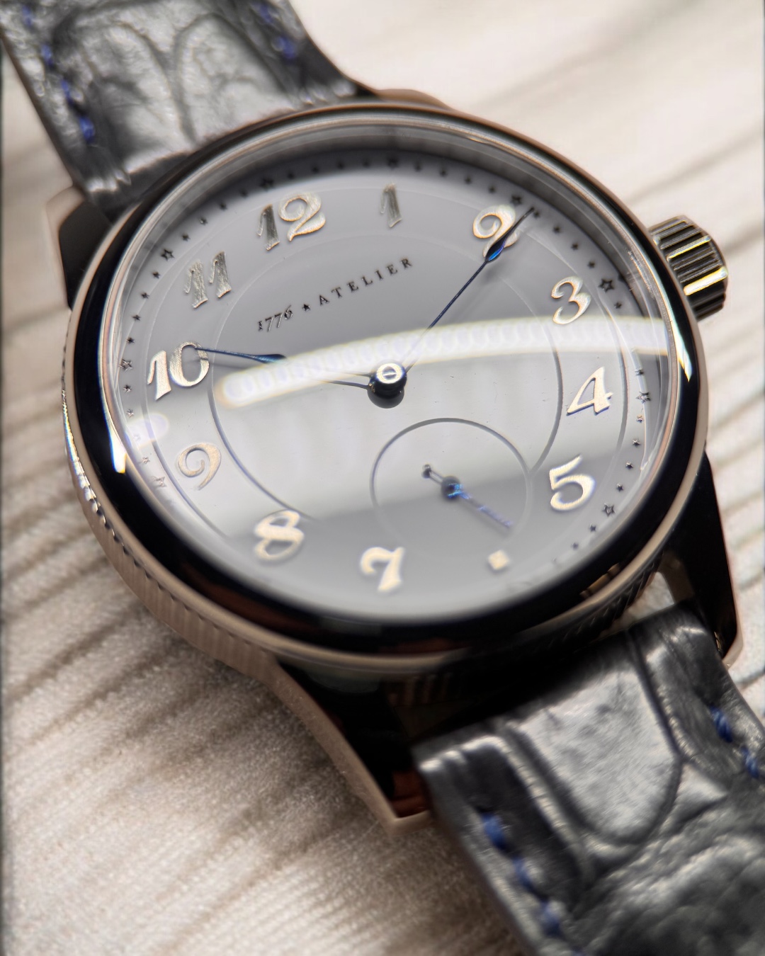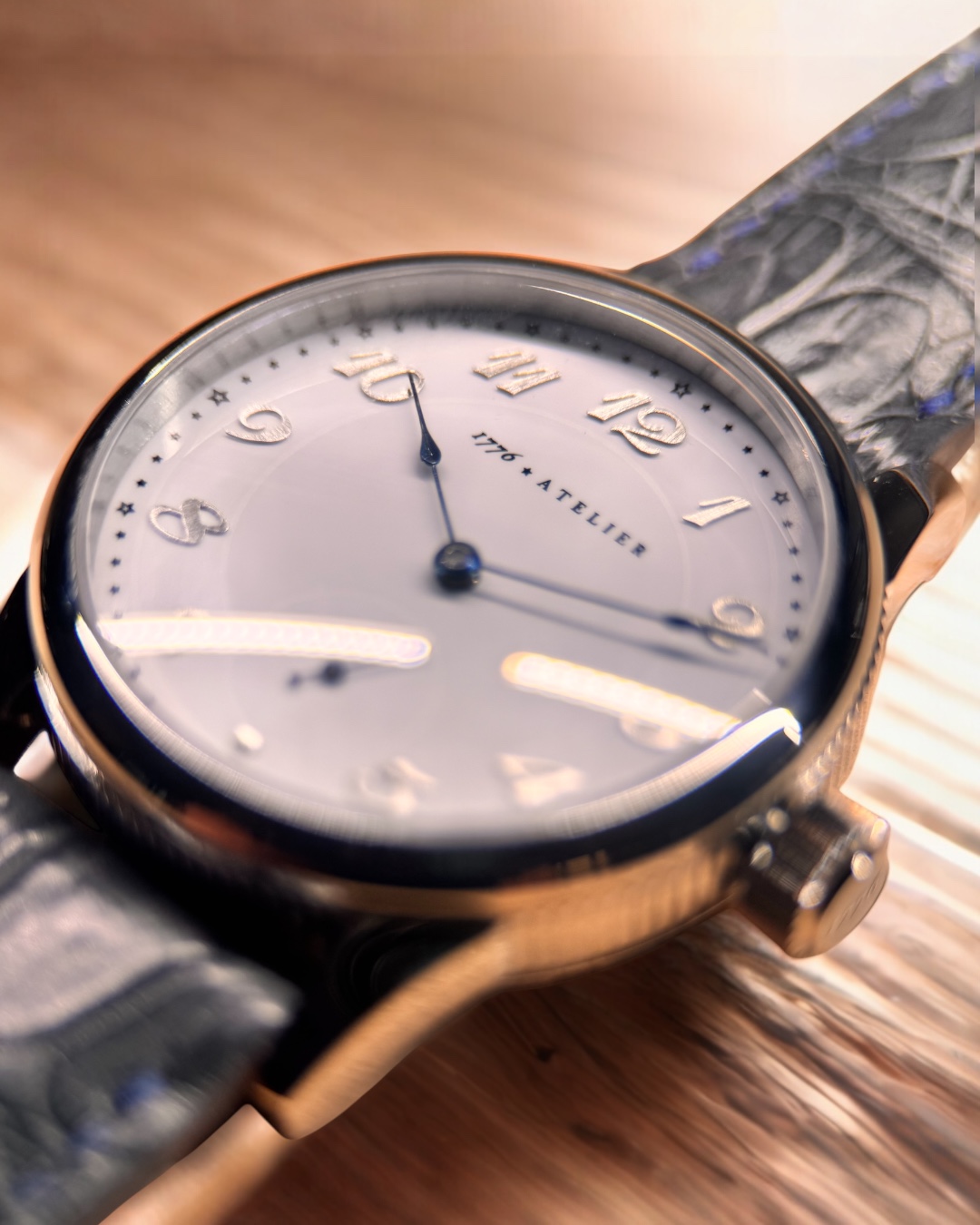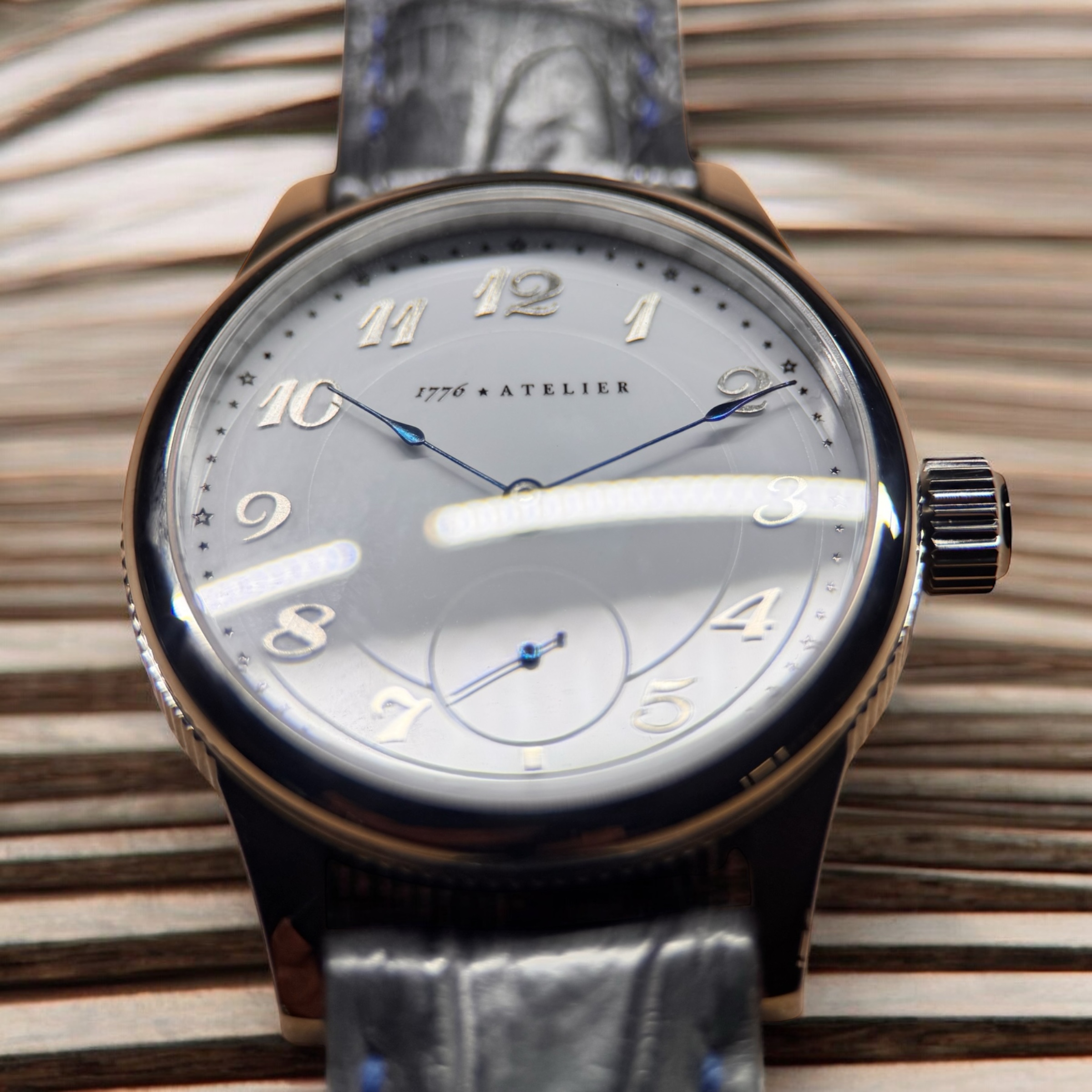 This historic Waltham timepiece was originally completed in 1906 in Waltham, Massachusetts, and features one of the company’s proprietary 15-jewel movements, beautifully finished with intricate damaskeening beneath a traditional three-quarter plate. The original hands have been carefully preserved and restored using thermal bluing—a precise, hand-applied technique that enhances both their deep hue and corrosion resistance. The original dial has been replaced with our own proprietary enamel dial—one of the defining trademarks of our conversion work and a key detail that sets our pieces apart from other offerings in the marketplace. Raised Breguet numerals, finished in a brushed metallic tone, provide contrast and dimension, echoing the sheen and texture of the stainless steel case while introducing subtle modernity. Twelve stars mark the hours around the numerals, while a thirteenth, embedded within our signature, serves as a quiet tribute to the original thirteen colonies and the founding ideals of 1776. To enrich the enamel’s surface, we have introduced delicate etching around the subdial and central area—an understated texture that gently disrupts the luster, adding depth and visual interest without overwhelming the design. Housed in a 40 mm surgical-grade 316L stainless steel conversion case, the watch offers an ideal fit for nearly any wrist. With both crown and caseback gaskets, it is water-resistant to 50 meters, though we recommend avoiding prolonged water exposure. Fully serviced and thoughtfully restored, this timepiece bridges over a century of American craftsmanship and is ready to accompany you on your next chapter.