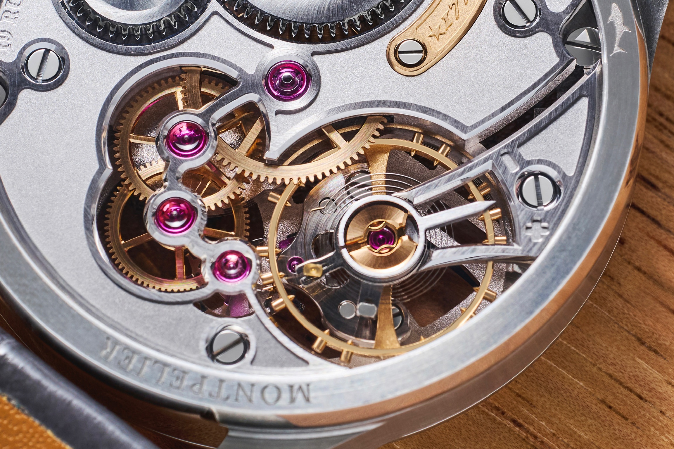The Montpelier houses a 19-jewel manual-wind movement, an evolution of the Monticello’s design. Two additional jewels have been added to fully support the mainspring barrel, reducing friction during power delivery and ensuring smoother, more efficient transmission through the gear train. The barrel cover is double solarization ground, its surface rippling with light as it unwinds.